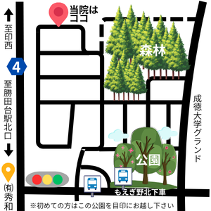 ●4つ目の信号を学園通りへ左折して40m先の側道をすぐ公園側へ左に入る